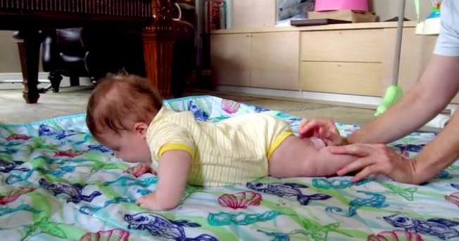 Stavite malo maslinovog ili baby ulja na unutrašnju stranu bebinih bedara i držeći bebu za gležnjeve, trljajte bedro jedno uz drugo. Stručnjaci ističu da je to vrlo bitno jer dijete sličan senzorički podržaj dobiva u majčinoj utrobi i to pomaže razvoju i organizaciji bebinog živčanog sustava. Također, to će bebi pomoći da se riješi bilo kakve fizičke napetosti u kukovima.S obzirom da se radi o stimuliranju živčanog sustava, nemojte ovo raditi u okruženju punom podržaja, na primjer na baby gymu ili pokraj upaljenog televizora, jer beba neće moći upiti cijeli doživljaj. Ova aktivnost traje samo minutu i neka bude u mirnom okruženju, bez gugutanja ili smijuljenja.