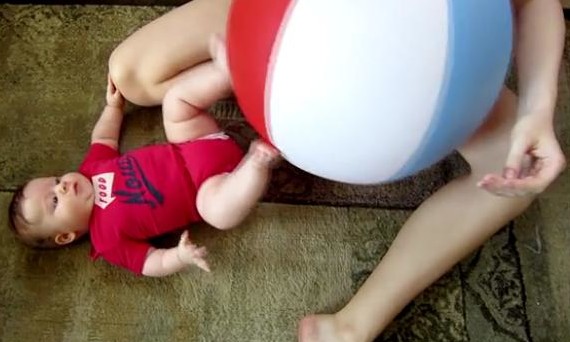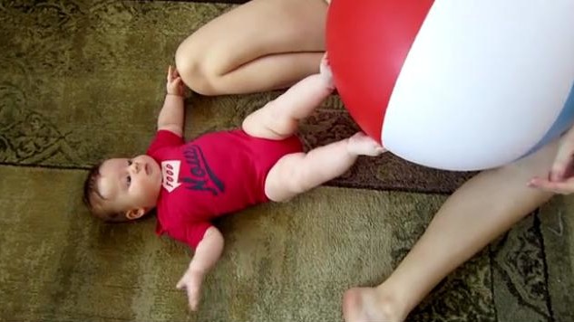 Uzmite loptu za plažu ili loptu za vježbanje i nježno položite bebu na loptu, trbuhom prema dole. Držite dijete jednom ili dvjema rukama, ovisno koliko dijete može kontrolirati svoje pokrete, i ‘rolajte’ ga naprijed nazad na lopti. Ova vježba je dobra zato što jača djetetove vratne mišiće, dobro je za kontrolu položaja glave te općenito za mišićni tonus cijelog tijela. Vježbu možete i ponoviti na način da dijete leži na leđima, što je dobro za reflekse i održavanje ravnoteže.