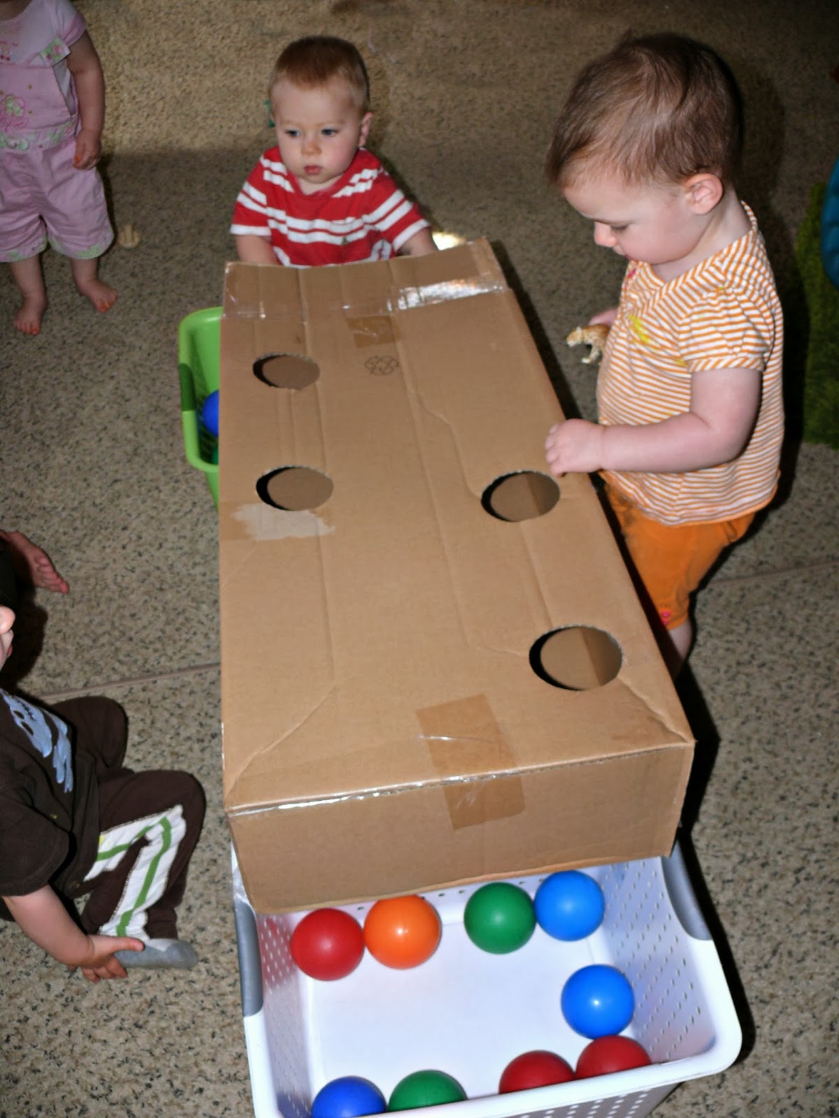 5. Uzmite kartonsku kutiju i izrežite rupe za lopte, a ispod stavite plastičnu posudu. Opskrbite dijete plastičnim loptama i potičite ga da ih sve gurne kroz rupe. Ovu igru može igrati i više djece.
