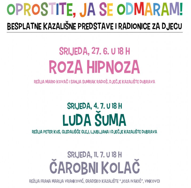 Narodno sveučilište Dubrava organizira besplatan program za djecu tijekom školskih praznika pod nazivom “Oprostite ja se odmaram”. Održavat će se besplatne kazališne predstave i radionice i to srijedama, 27. lipnja, zatim 4. i 11. srpnja u Dječjem kazalištu Dubrava na adresi Cerska 1.