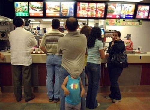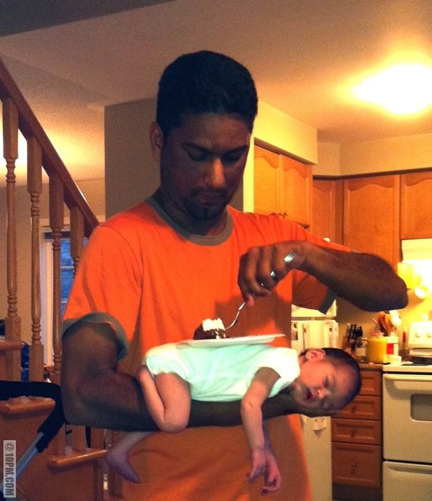 Ako je dijete zaspalo, nema razloga da ne pojedete kolač….Dječja leđa u ovom slučaju su poslužila kao stol…Tata očito dijete nije smio spustiti jer bi se probudilo. Vjerujemo da je ovo bio očajan potez gladnog tate.