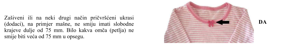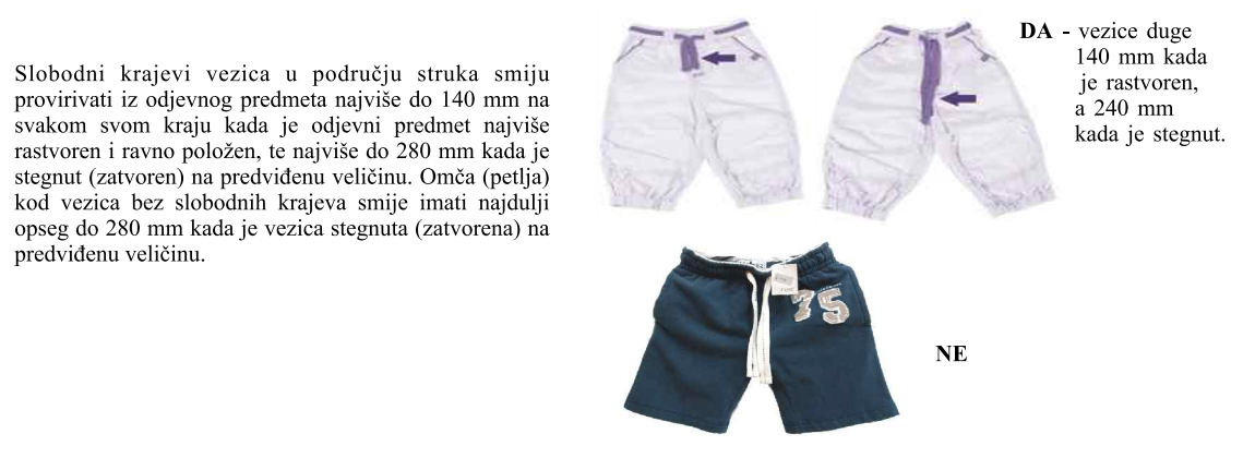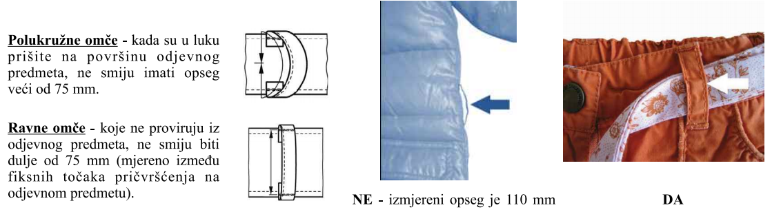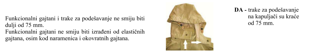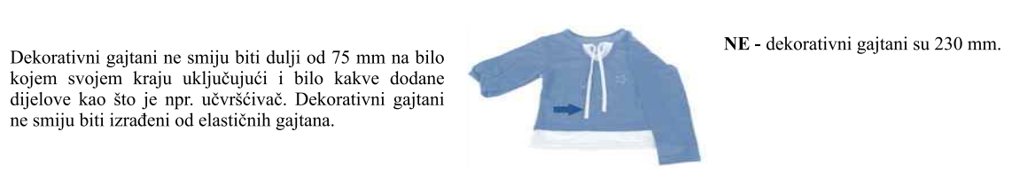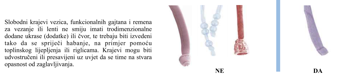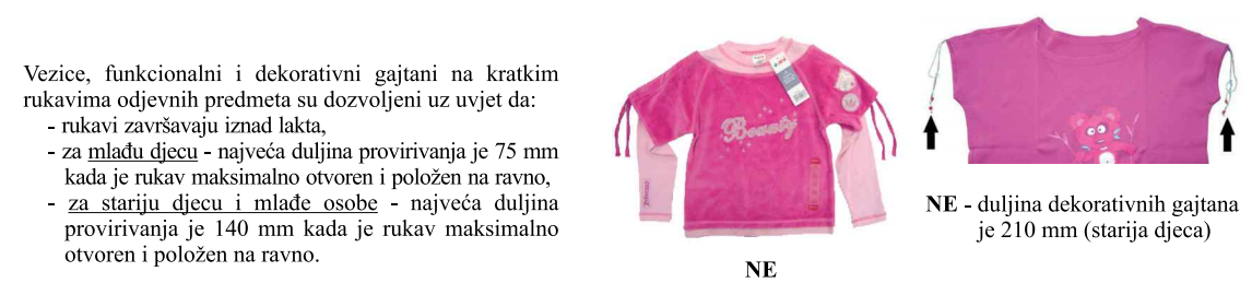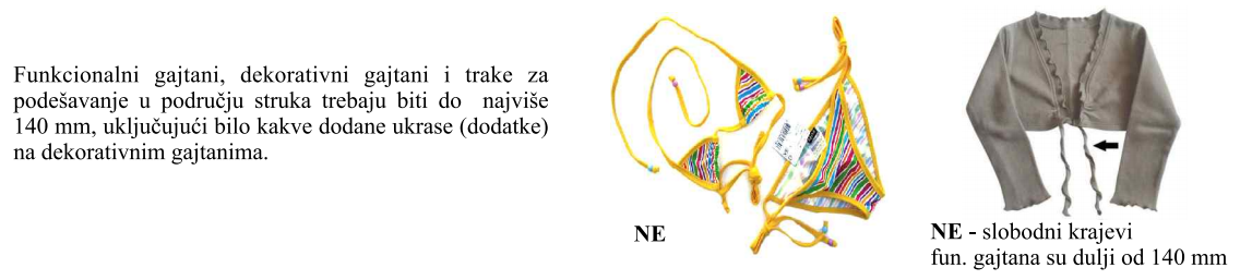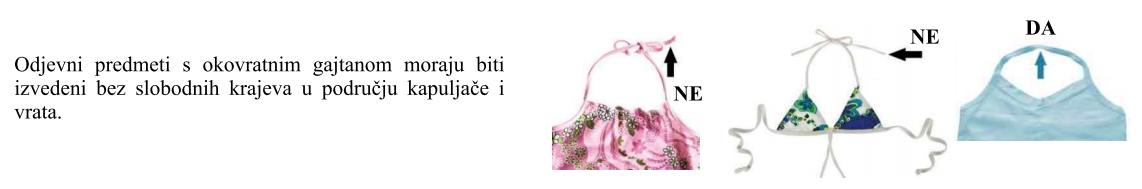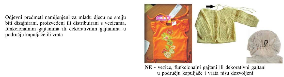 Proizvodi koji se stavljaju na tržište pa tako i dječja odjeća moraju biti sigurni. To su proizvodi koji u normalnim uvjetima uporabe ne predstavljaju veći rizik spojiv s uporabom proizvoda. Djeca kao posebno osjetljiva kategorija potrošača, u svojoj igri moraju biti sigurna, a sodnosno dječja odjeća s gajtanima i vezicama predstavlja opasnost koja može završiti sa smrtnim slučajem. Donosimo popis kako moraju izgledati sve vrste vezica na dječjoj odjeći