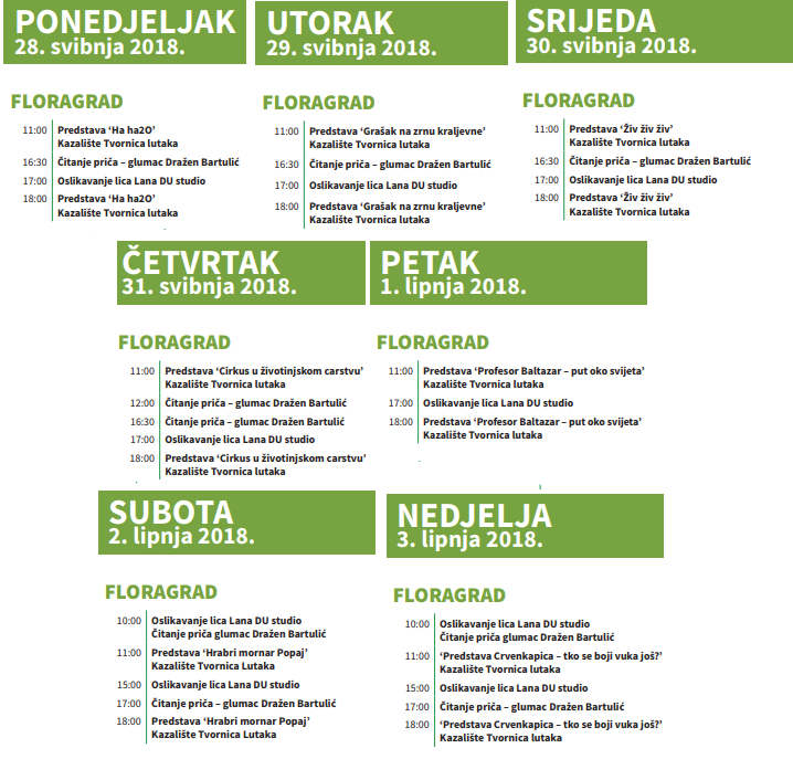 Kazališne predstave i čitanje priča obogatit će dječji program na ovogodišnjem Floraartu, kao i oslikavanje lica te brojne zabavne radionice. Predstave su na programu svaki dan u 11 i 18 sati, a izvodit će ih kazalište Tvornica lutaka.