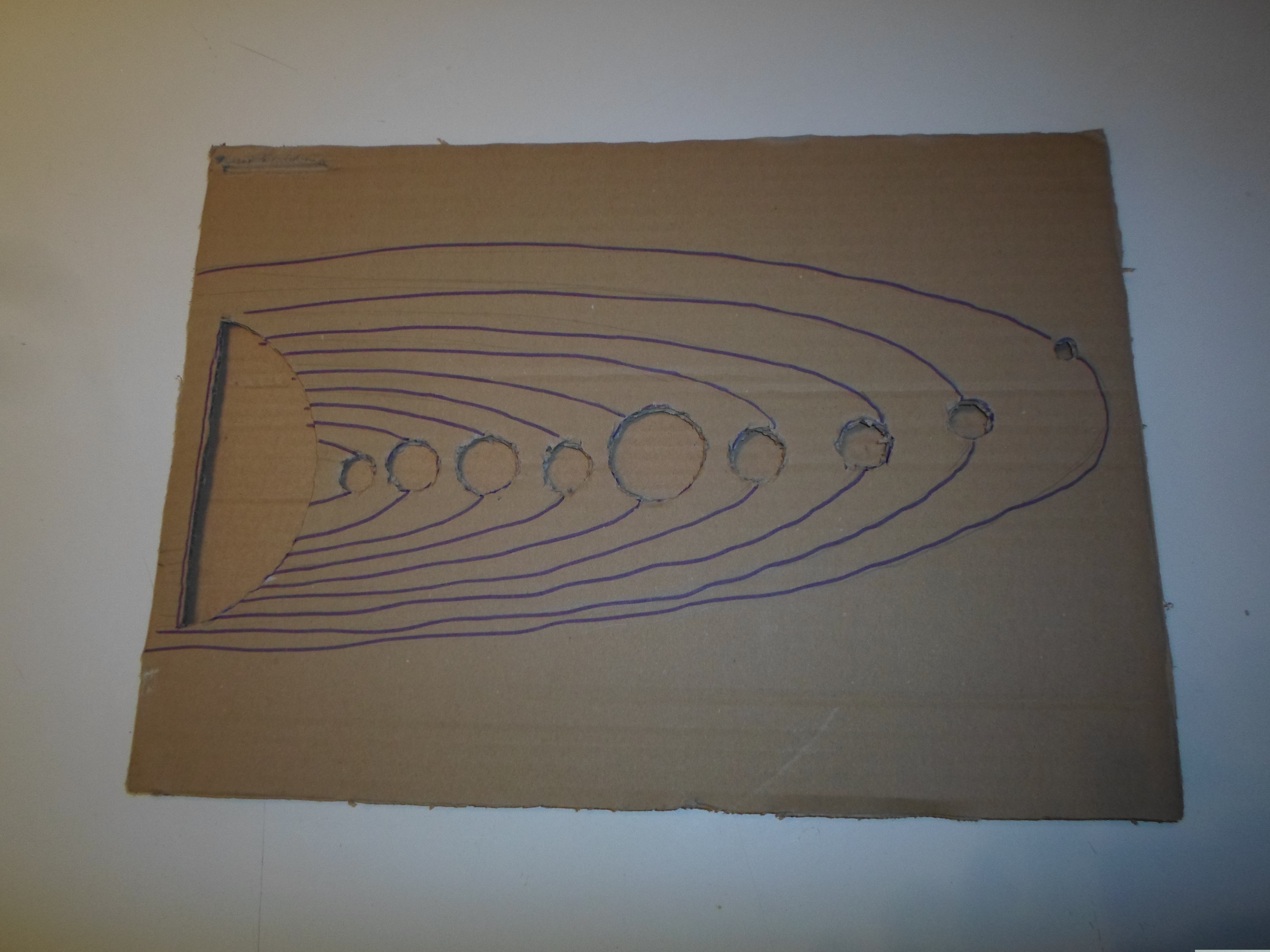 Za početak izrežite dva jednaka komada kartona. Jedan će vam služiti kao podloga a u drugome urežite krugove prema tome kako ćete postaviti Sunce i planete.
