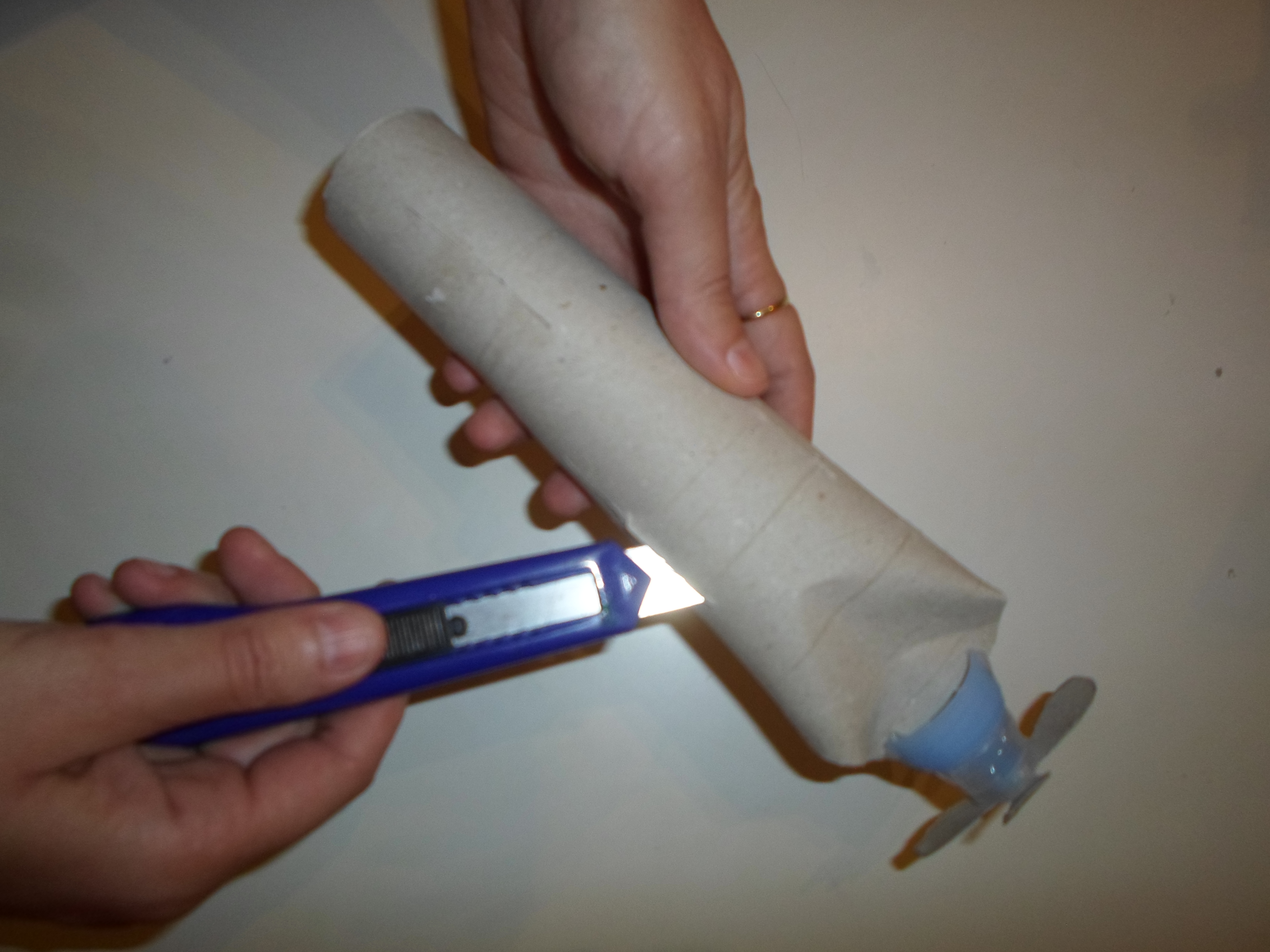 Od druge rolice izrežite krila i krilca aviona, rep i propeler. Njega zalijepite na čep dudicu, a za krila, krilca i rep izrežite utore u tijelu aviona te mališana potaknite da te izrezane dijelove aviona umetne na njihova mjesta.