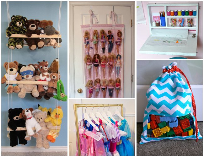 4. Za plišane igračke možete napraviti neku vrstu ljuljačke i objesiti ih da vise sa stropa, a obični plastični kozmetički spremnik možete staviti na vrata i smjesta dobivate ormar za barbike! Za stotine kocki možete sašiti ili kupiti dekorativne pamučne vrećice.