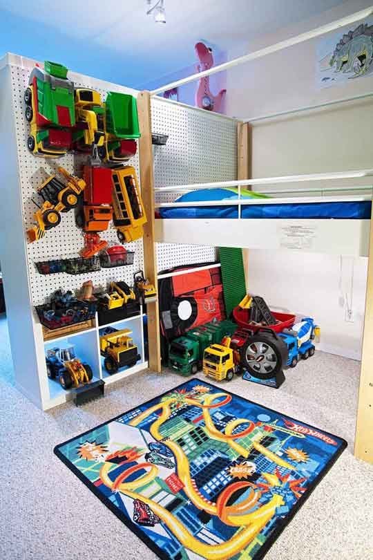 1. Ako koristite sobnu pregradu, igračke možete pomoću malih kukica objesiti na nju, a dobra je ideja da ako dijete spava na povišenom krevetu, prostor ispod kreveta upotrijebiti za spremanje.