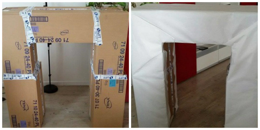 Zaljepite kutije selotejpom u obliku kamina, a potom ih obložite bijelim papirom.