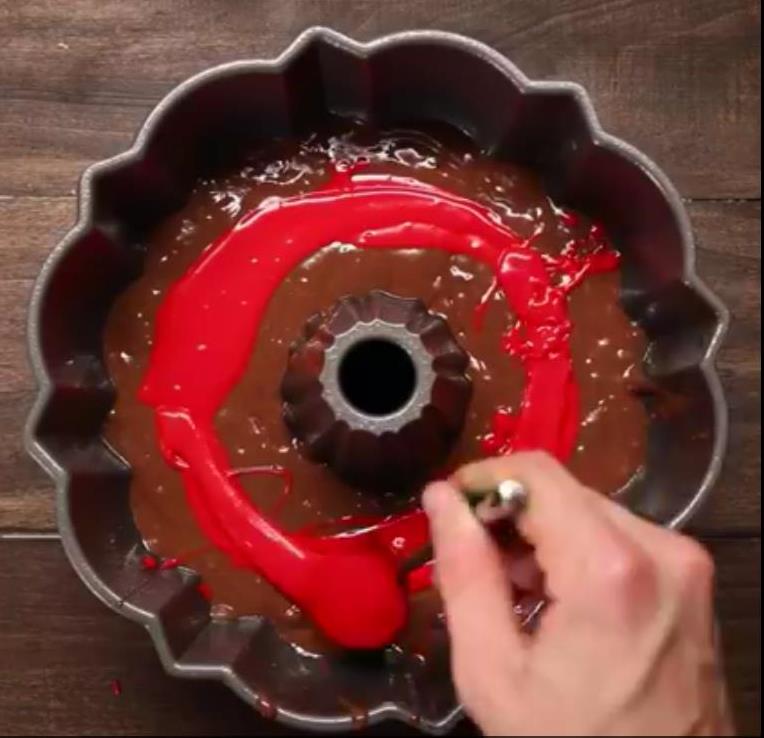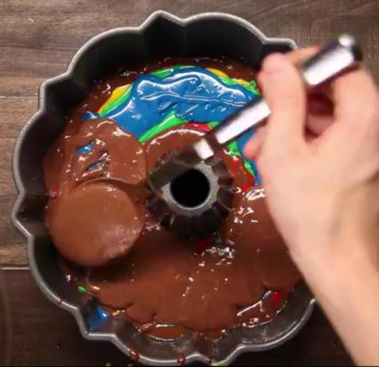 Potom dodajte ostatak čokoladne smjese koja će prekriti boje no ipak pazite da 1/3 kalupa ostane prazna da se kolač može podići.
