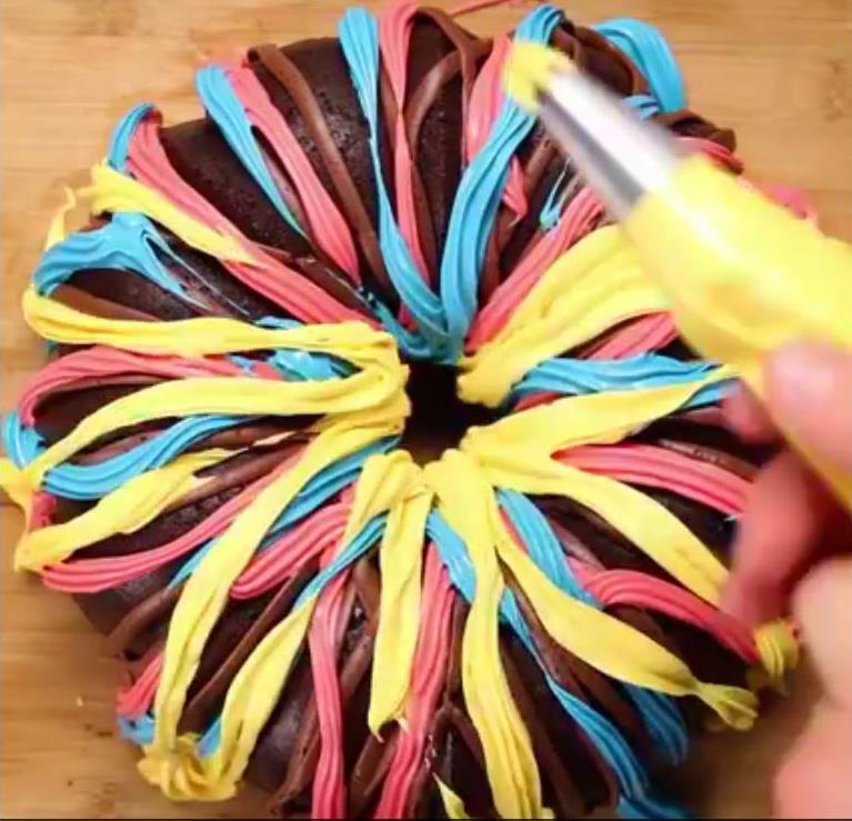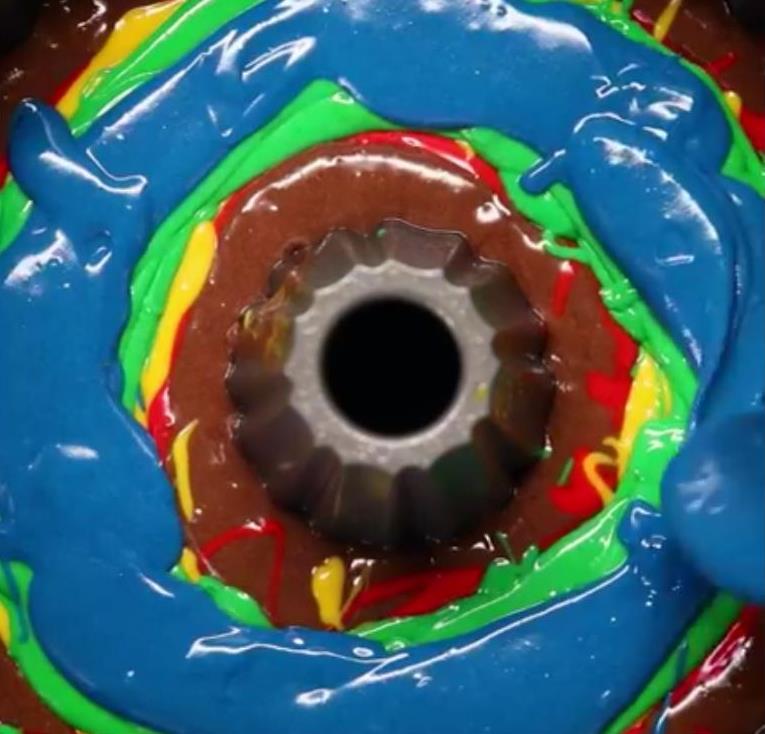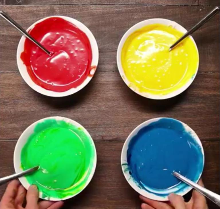 Koristeći žlicu, pažljivo dodajte tanki prsten svake boje zasebno. Prvo krenite s jednom bojom lagano u krug pazeći da se boja ne razlije do ruba. Ponovite s drugim bojama svaki put stavljajući jednu po drugoj.