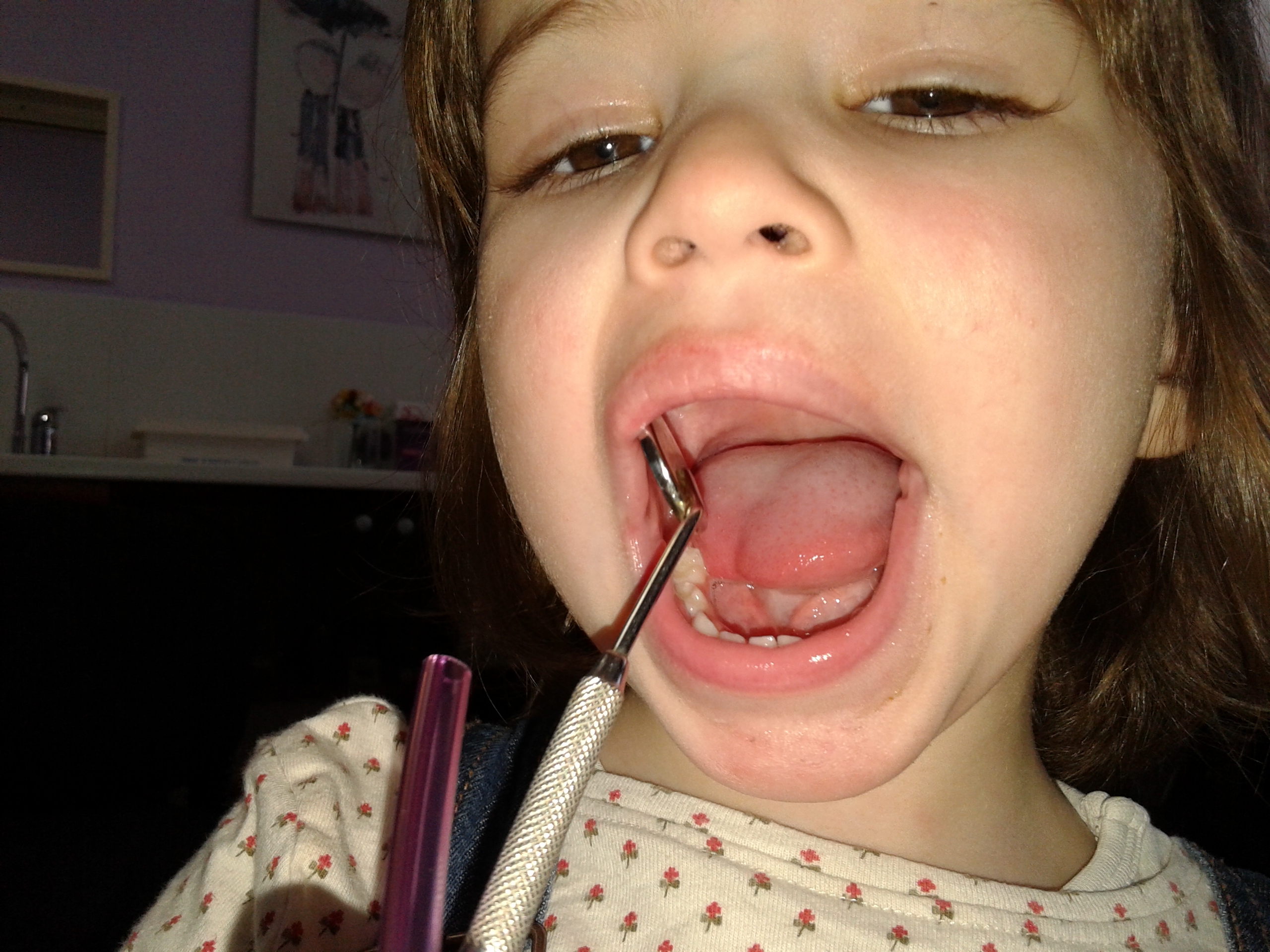 Nakon što su se naša kćer i tata poigrali sa stakalcem za pregledavanje zuba, spretna doktorica je to iskoristila da i sama ‘baci pogled‘ u usnu šupljinu i tako je u stvari kroz igru uspjela pogledati sve zube. Na sreću, nismo imali niti jedan karijes.
