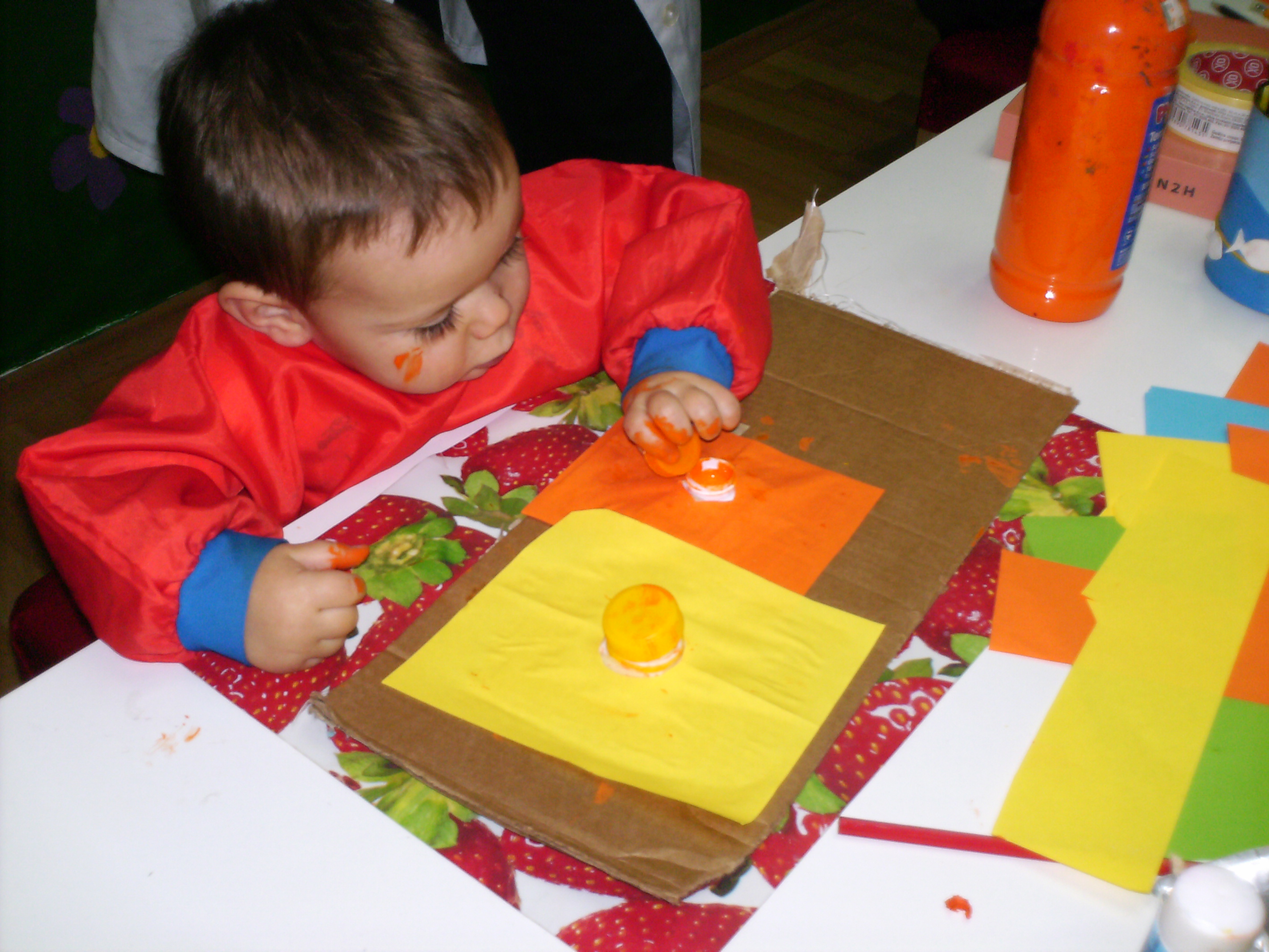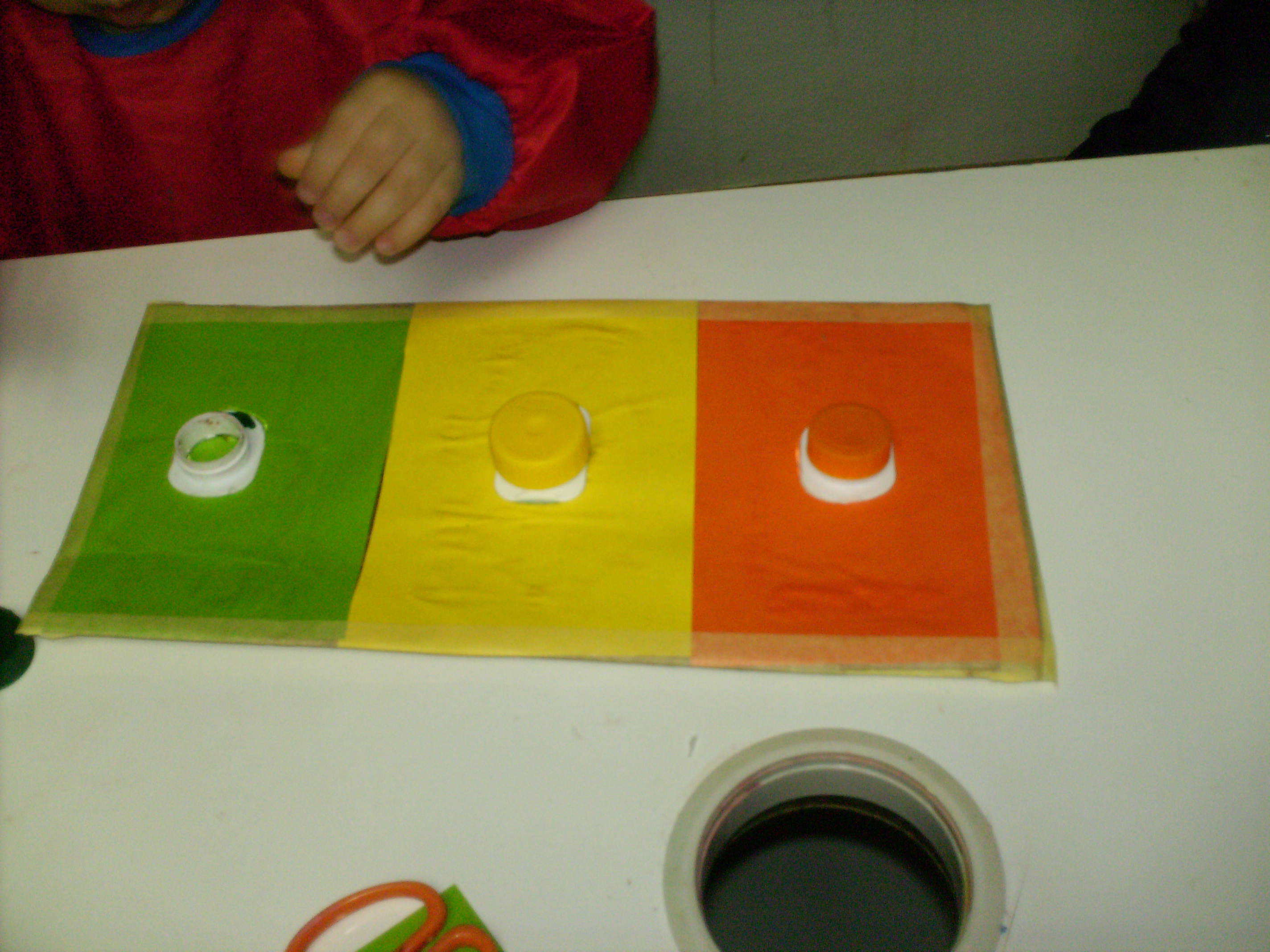 Kad ste izrezali šarene kolaže, zalijepite svaku boju oko jednog čepa. Površinu unutar čepa, koja vam je ostala u boji kartona kad ste ga maknuli, obojajte kistom i temperama u bojama svakog kolaža. Istim tim bojama obojajte u čepove.