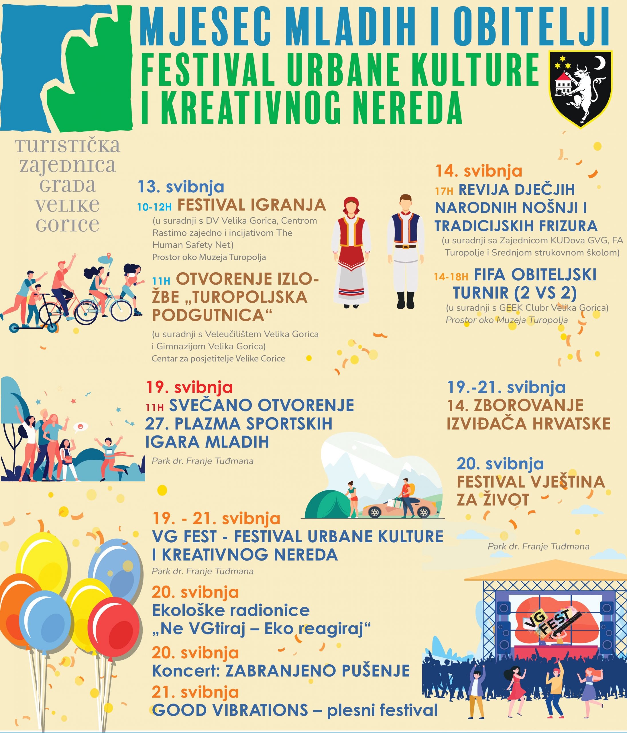 Svibanj – mjesec mladih i obitelji obilježit će se po prvi put u Velikoj Gorici gdje su organizatori pripremili niz različitih događanja. Festival igranja, Revija dječjih nošnji, FIFA obiteljski turnir, izložbe “Turopoljska podgutnica” i „Obiteljska priča“, Zborovanje izviđača Hrvatske i Festival vještina za život, Otvorenje Plazma Sportskih igara mladih, veliki koncert grupe Zabranjeno pušenje, radionice i druge aktivnosti vezane uz zaštitu okoliša samo je dio onog što očekuje posjetitelje.