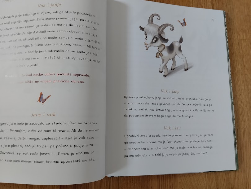 Prva slikovnica je u stvari zbirka basni koja se proteže na prekko 100 stranica pa itekako ima što za čitati ako vam djeca vole male mudre i poučne priče u kojima su glavni likovi životinje. Nije na odmet spomenuti da su u ovom djelu sabrane najzanimljivije basne proslavljenih autora. Ezopa, koji je po basnama i najpoznatiji, no tu je i naša Ivana Brlić Mažuranć te Krilov i La Fontaine.