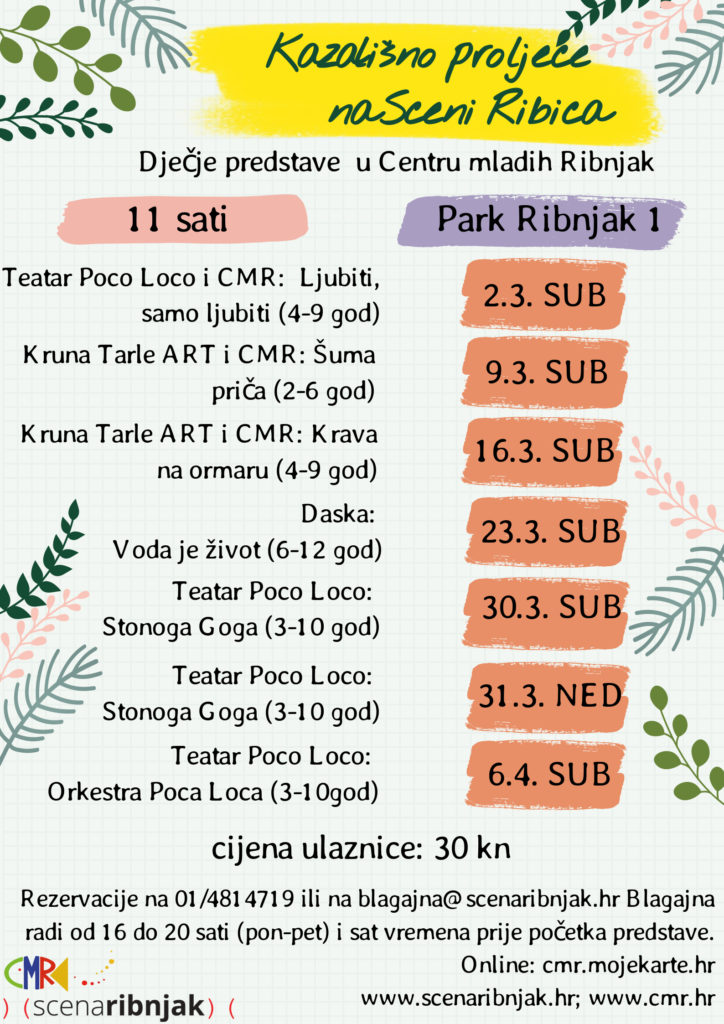 Centar mladih Ribnjak i Scena Ribica donose pregršt zanimljivih dječjih predstava ovog ožujka. Riječ je o predstavama subotama u Centru mladih Ribnjak, a ciklus dječjih predstava počinje već ove subote 2.3. predstavom ‘Ljubiti, samo ljubiti’ kreativnog Teatra Poco Loco.