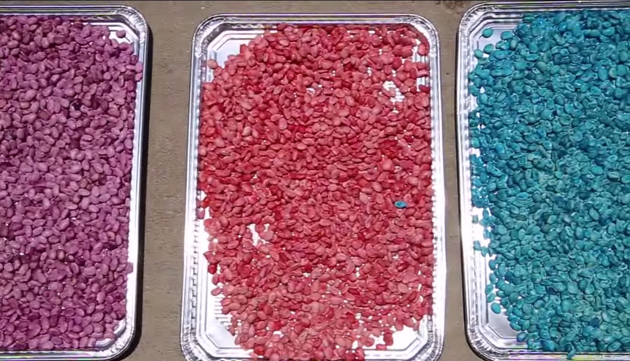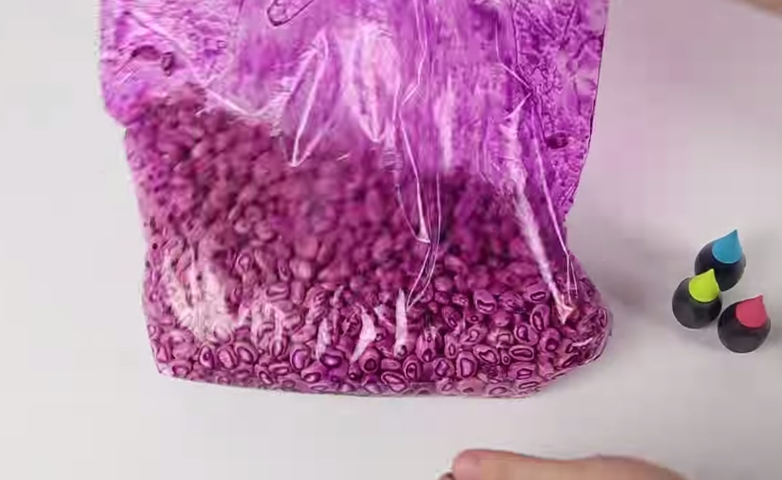 Za svaku boju potrebne su vam barem dvije šalice graha. Stavite ga u plastičnu vrećicu i dodajte oko 15 kapi jestive boje. Nakon boje dodajte otprilike manju šalicu alkohola koji će pomoći proširiti boju ali će djelovati i na grah jer će mu povećati moć upijanja pa će se brže i jače ofarbati.