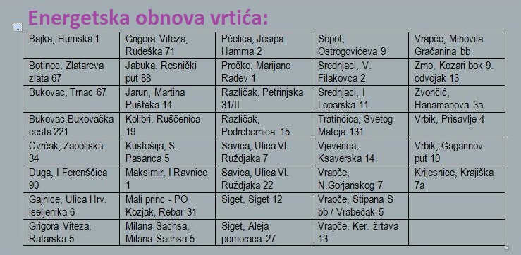Uz to, u tijeku je i projekt kojim se tijekom 2016. i 2017. planira energetska obnova 38 zgrada dječjih vrtića građenih prije 30-ak godina. U njima će se zamijeniti stolarija, sustav grijanja i hlađenja te će se obnavljati fasade. Tako će iz lošeg energetskog razreda F prijeći u razred B. Osigurat će se adaptacije i uređenja postojećih prostora u nenamjenskim objektima s ciljem veće funkcionalnosti prostora za namjenu dječjeg vrtića i humaniziranja okruženja po mjeri djeteta. Osigurat će se nabavka didaktike u novim odgojnim skupinama ili prenamijenjenim odgojnim skupinama (najčešće iz vrtićkih u jaslički prostor) i nabavka specijalizirane didaktike u skupinama s posebnim potrebama (djece s teškoćama u razvoju i darovite djece).