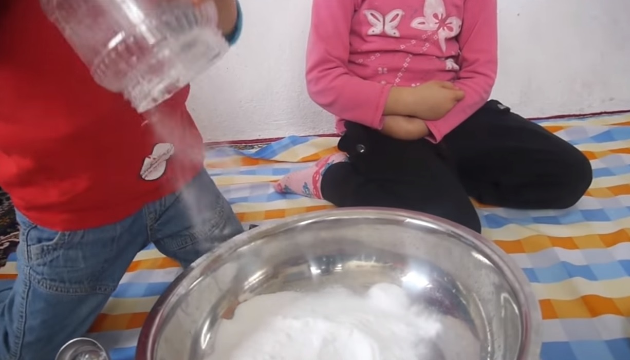 1. Neka djeca sipaju pola do jednog kilograma sode bikarbone u staklenu zdjelu
