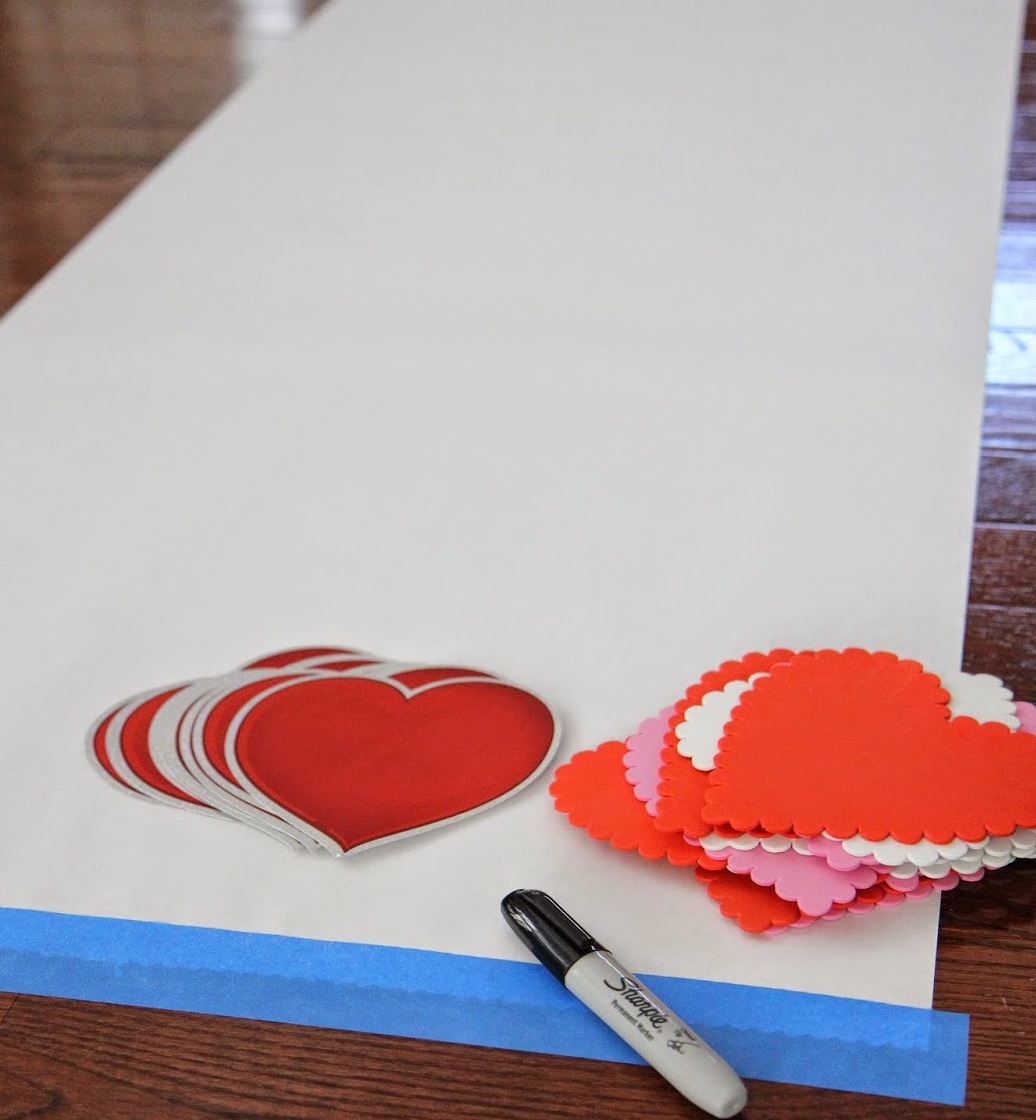 Zatim izrežite od tvrđeg kartona 32 srca. Nekima izrežite ravne rubove, nekima djetelinaste.Potom sva srca postavite na bijeli papir na podu i ocrtajte ih na papiru. Posložite ih tako da stanu sva i da je između njih jednaka udaljenost no ne u pravilnim linijama već ih slobodno razmaknite, ovisno koliko imate prostora.