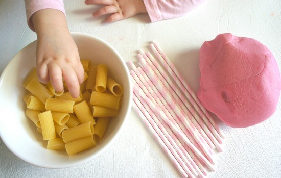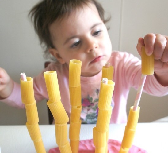Kako bi se djeca rado igrala s ovom edukativnom slagalicom iz kućne radionice mijenjajte razne oblike tjestenine kako bi ih iznova oduševili, mijenjajte boje tijesta ili pak dužinu slamčica…