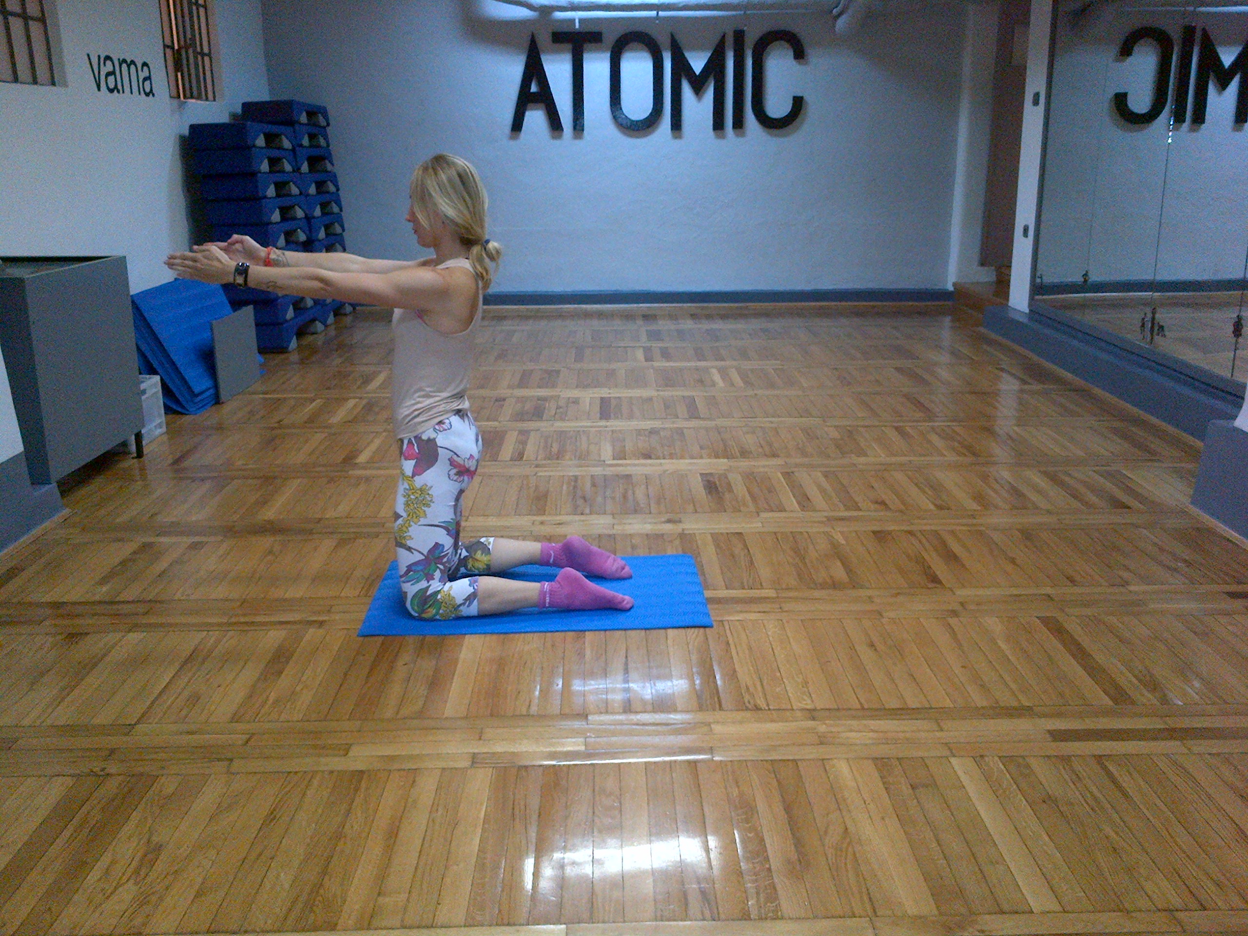 - Kad ste prethodnu vježbu savladale, pokušajte ići malo dalje i napravite jednu vježbu istezanja prsiju pa dotaknite pete (ako možete), (ako ne možete, stavite ruke na donji dio leđa i malo se sagnite), izbacite prsa, kukove prema van, zabacite lagano glavu unazad i ostanite u tom položaju 3 udaha i 3 izdaha. Kad se želite vratiti na koljena i u sjedeću poziciju, duboko udahnite, stisnite trbuh i polako se vratite prema naprijed.